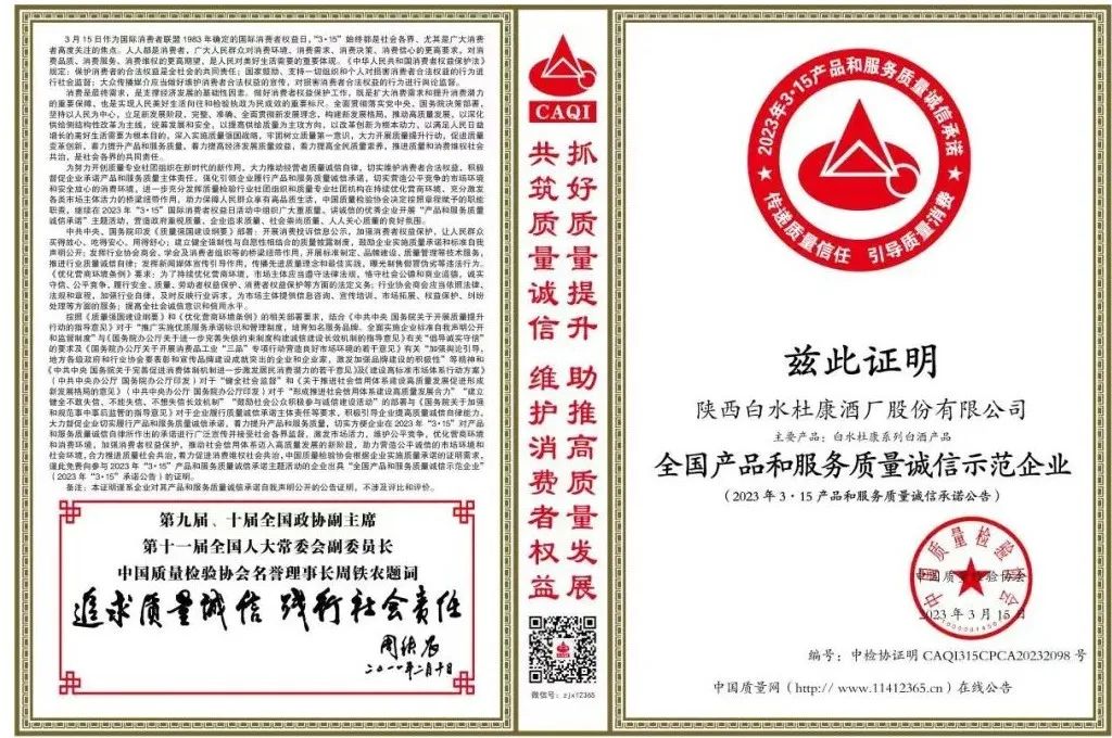 “3·15”国际消费者权益日,陕西草莓SOLO视频下载酒厂股份有限公司和旗下的“草莓SOLO视频下载”品牌,顺利通过中国质量检验协会“近三年经全国第三方监督抽查、质量检测、检验检测,且无产品质量不合格记录”等严格筛选,应邀参加2023年“3·15”国际消费者权益日“产品与服务质量诚信承诺”主题活动,在中国质量网、中国质量信誉网、中国质量报、中国消费报等媒体平台上,进行产品与服务质量公开承诺,诚恳接受广大消费者监督。中国质量网也为其出示了“全国产品与服务质量诚信示范企业”“全国消费者质量信誉保障产品”“全国白酒行业领先品牌”等三份证明。
