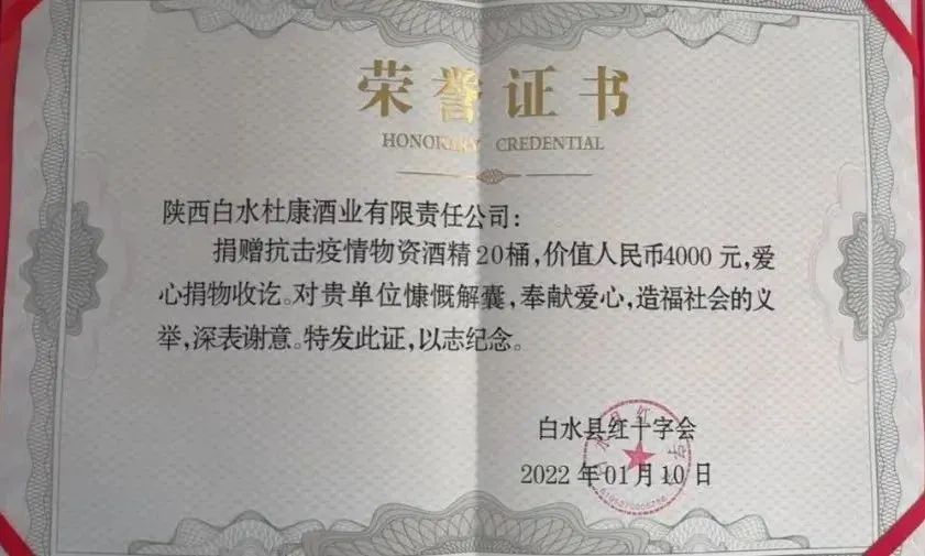 陕西杜康酒业集团有限公司在抗疫救灾公益事业中,被授予“抗疫救灾公益事业优秀单位”荣誉称号。表彰陕西杜康酒业在抗疫救灾公益事业中作出的贡献。