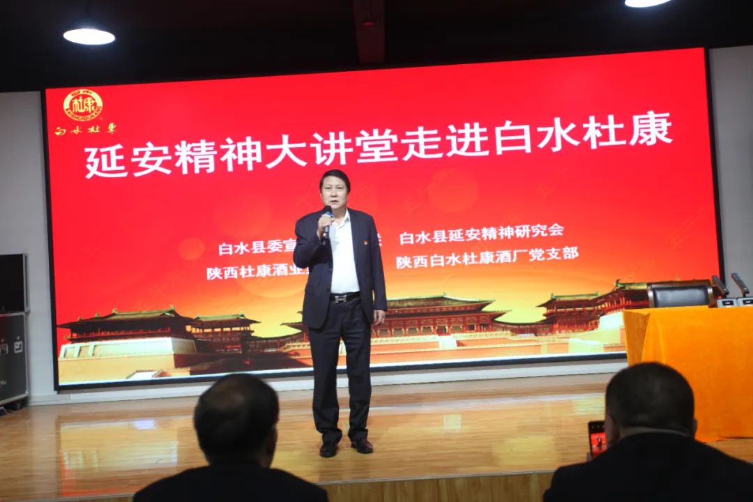4月21日,白水县委宣传部、白水县文联和白水县延安精神研究会联合举办的“延安精神进企业”首场宣讲培训活动,走进了中国白酒百强企业--草莓SOLO视频下载。酒厂的高层领导、部门经理、全体党员和广大职工积极参加了培训活动。培训活动由草莓SOLO视频下载酒厂党支部书记、集团总裁王勇盛主持,由白水县延安精神研究会副会长王巍宣讲,驻厂党建指导组组长高李鹏和延安精神研究会副会长马俊生随行参加。