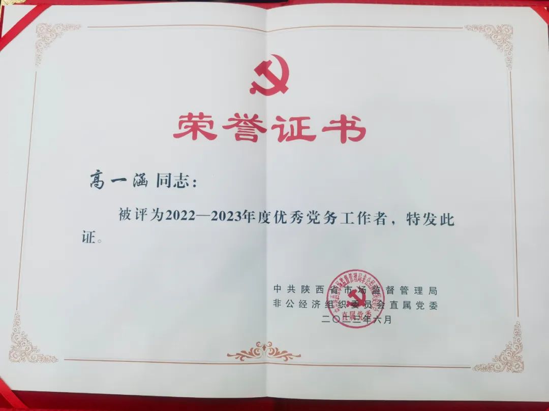 陕西杜康酒业集团有限公司董事长张红军获“优秀共产党员”,支部书记高一涵获“优秀党务工作者”称号。