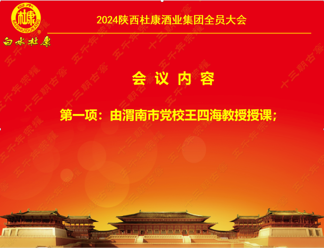 【概要描述】1月3日,陕西杜康酒业集团召开“新起点 新征程 再出发”书写新辉煌表彰大会,集团党委书记周军,董事长张红军,总裁王勇盛,副总裁商景枫,各事业部负责人,各区域销售人员及员工代表200余人参会。
