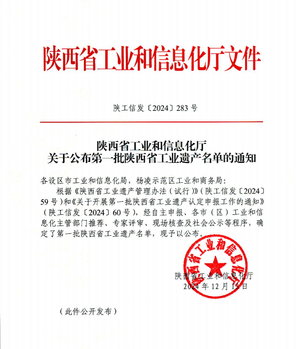 【概要描述】近日,陕西省工业和信息化厅正式公布了第一批陕西省工业遗产名单。此次评选根据《陕西省工业遗产管理办法(试行)》及《关于开展第一批陕西省工业遗产认定申报工作的通知》的相关规定,经过自主申报、各市(区)工业和信息化主管部门推荐、专家评审、现场核查及社会公示等一系列严格程序,最终确定了这份具有历史意义的名单。