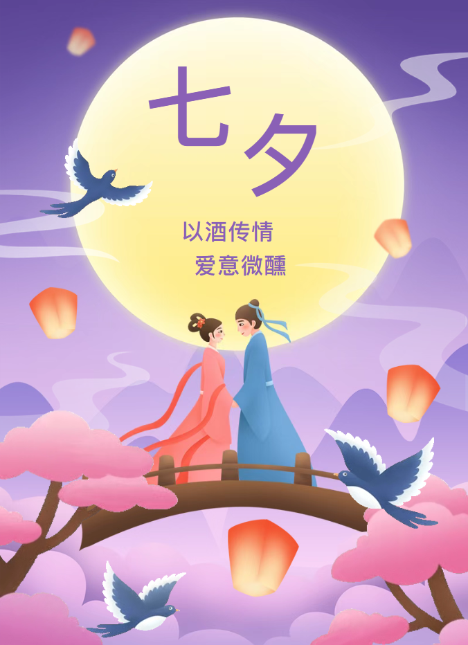 唐玄宗与杨贵妃就在七月七日七夕节这天,深夜祭拜牛郎织女二星,并发至死不渝白头偕老的爱情誓言。经过慢慢的发展逐渐形成了约定俗成每年只能乞一,不得兼求。祈毕,饮酒为乐,形成七夕酒俗,代代相承。